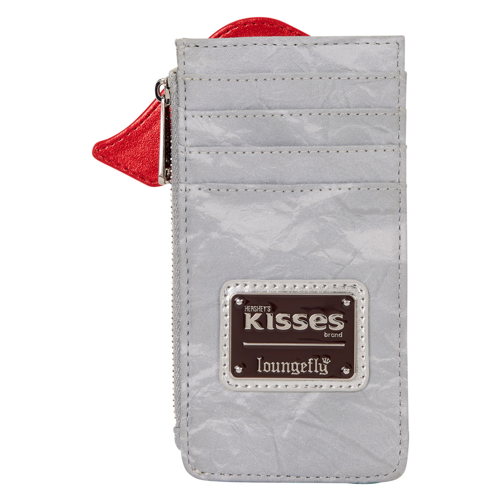 This card holder features three Hershey's Kisses stacked on top of each other, one is red, one is silver, and one is green. Each has silver foil snowflakes on its wrapper. Silver metallic faux leather covers the rest of the card holder. Turn it around to find four card slots!