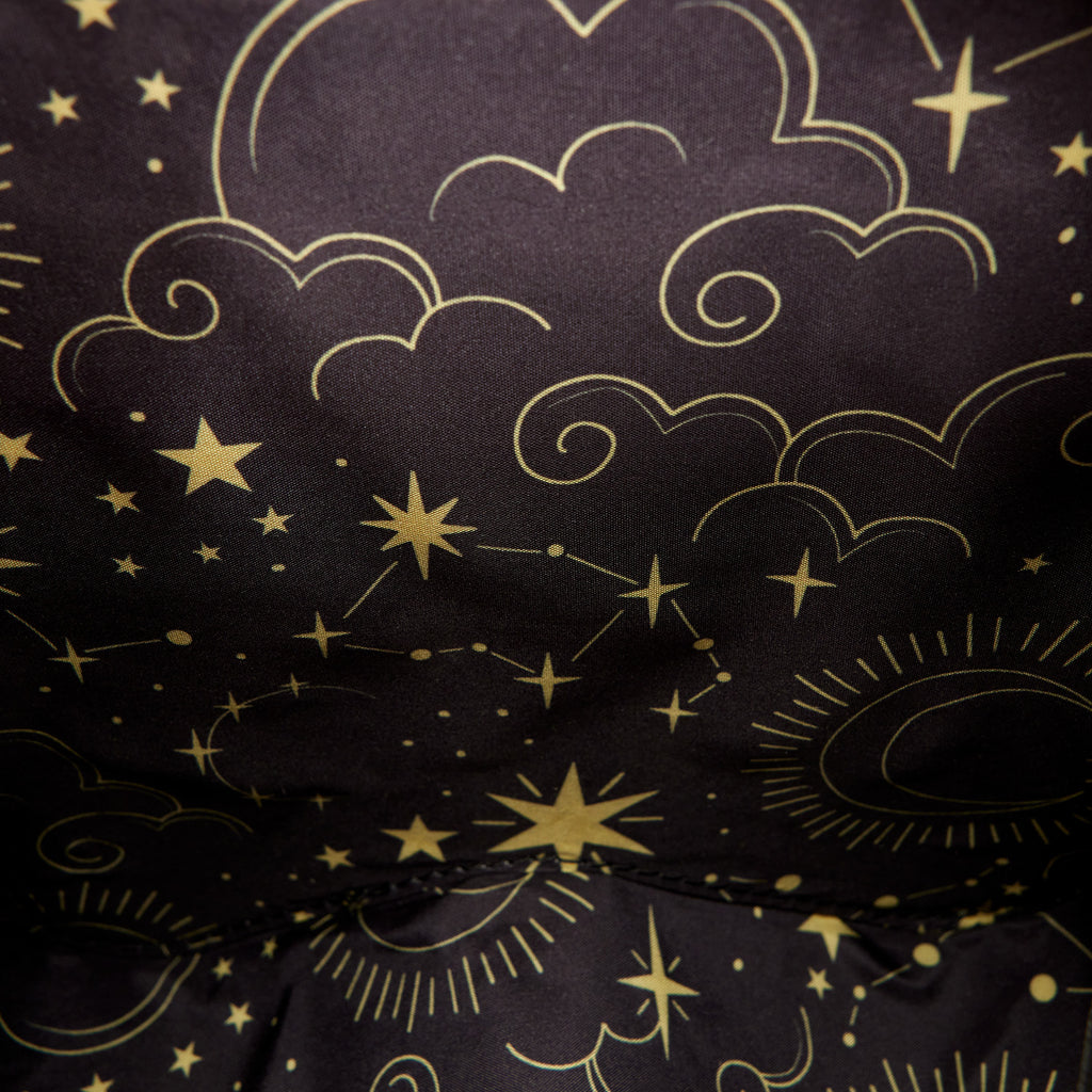 This crossbody bag is in the shape of a star. It's covered in golden sequins and molded metal star charms. You'll even find star charms attached to the crossbody strap!