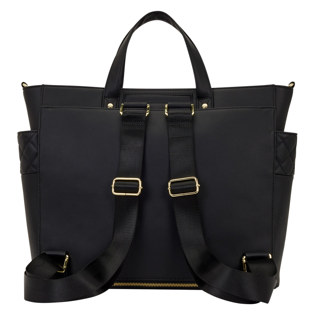 This bag converts between a backpack and a tote bag. Sleek black faux leather makes it the perfect bag for any workplace – but you can still have some fun by customizing it! On the front, you'll find a quilted section with embroidered pin holes, allowing you to stick on your own pins to customize your look!