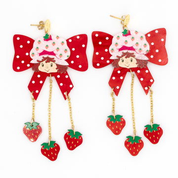 The bold red polka-dot bow frames Strawberry Shortcake’s adorable face, with her layered head design adding depth and dimension to the piece. Dangling gold-tone chains hold a cascade of tiny strawberries, giving these earrings playful movement and an extra pop of berry fun. Crafted from layered acrylic with gold metal details, they’re built to be both eye-catching and collectible.