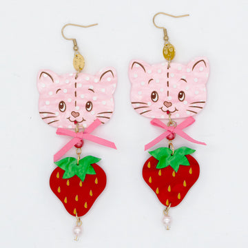 Each earring showcases Custard’s adorable pearlescent face paired with a layered strawberry that gives the design depth and dimension. A delicate satin ribbon bow ties it all together, adding a soft, whimsical touch to this vibrant design.