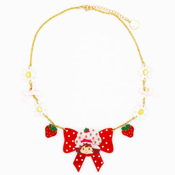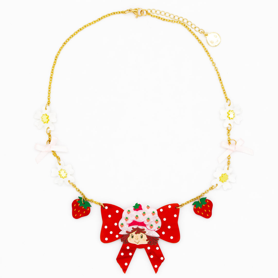 Bring a little Strawberryland magic to your outfit with the Strawberry Shortcake™ Berry Bow acrylic necklace—a statement piece that’s as sweet as it is stunning. Crafted with layered acrylic charms featuring Strawberry Shortcake herself, dainty strawberries, and cheerful daisies, this necklace is a celebration of color, nostalgia, and whimsy.
