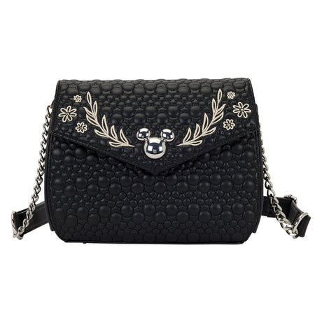 This crossbody features a quilted pattern all over of Mickey Mouse silhouettes. Over the front flap, you'll find a metal charm of Mickey's silhouette, flanked by embroidered flowers and leaves. It's a fun way to add a flourish of Disney magic to your outfit!